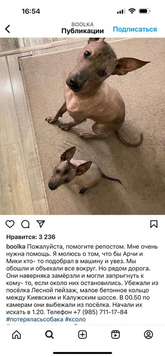 Уже 1,5 месяца хозяева пытаются найти своих собак специфической породы - голая мексиканская. Им не выжить на улице. Трупов собак не нашли - всю территорию обыскали. Это дает надежду, что собак подобрали и увезли куда-то.