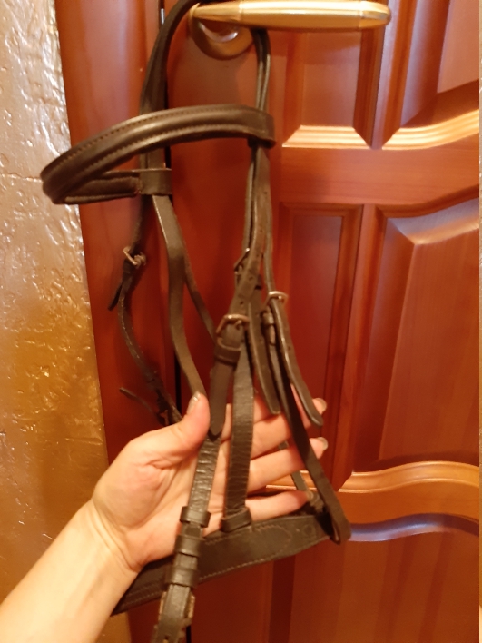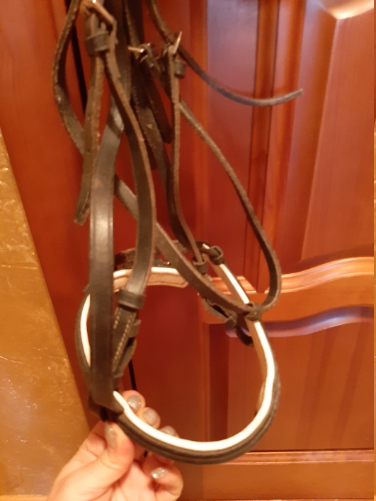 1. Темно-коричневое кожаное оголовье на Коб (Cob), капсюль на подложке, чтобы исключить надавливание/натирание на храп, не рваная/не зашитая, все ремни целые. без повода. Цена 1500руб.