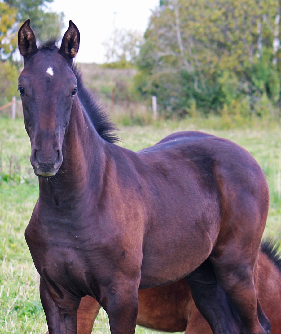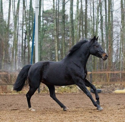 Темно -гнедой( на вид вороной).На шикарных летящих движениях, что дает большую перспективу в профессиональную выездку.( родословная папы насыщена выездковыми конями,мамы конкурными,что дает универсальность в использовании в спорте) .Внук выездкового Uphill Oscar ,конкурных-Alma Z Rebel I Ahorn Langraff etc