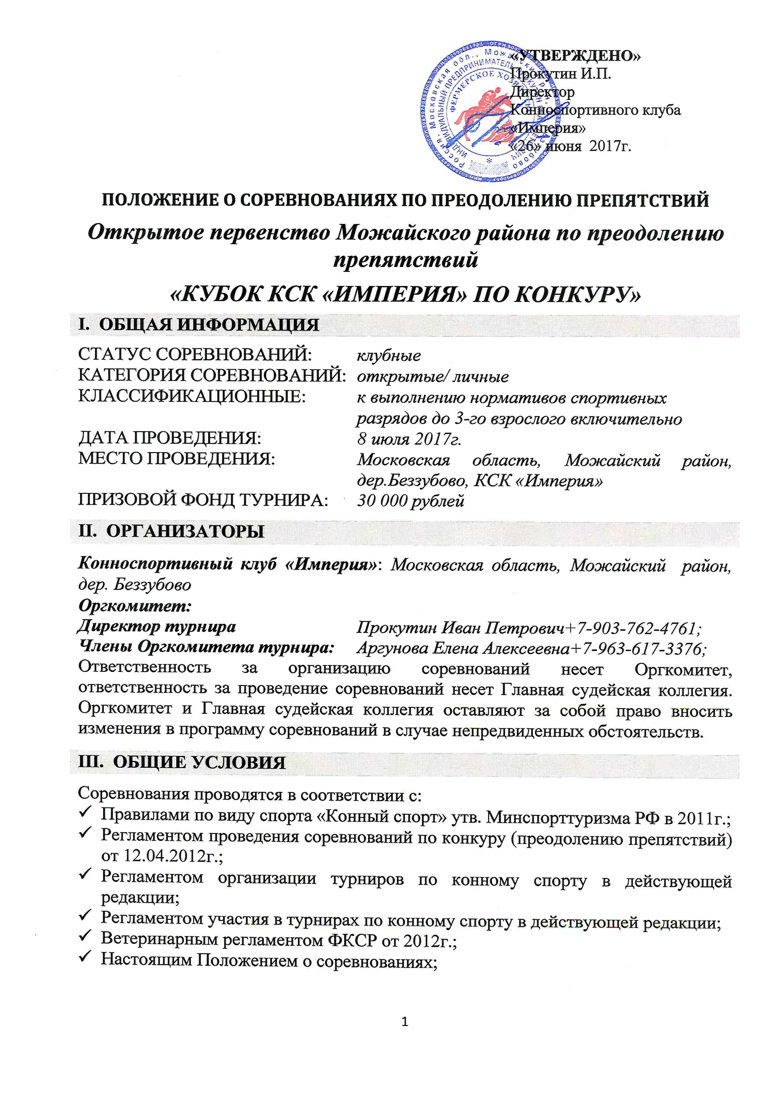Мы рады сообщить, что Конно-спортивный клуб "Империя" (Московская область, Можайский район, д.Беззубово) возобновляет проведение соревнований по конному спорту, и приглашает всех принять участие в Открытом первенстве Можайского района по конкуру "Кубок КСК "Империя". Предварительные заявки подаются до 07.07.2017г. по e-mail: ooo_landgraf@mail.ru или по тел: 8-963-617-33-76