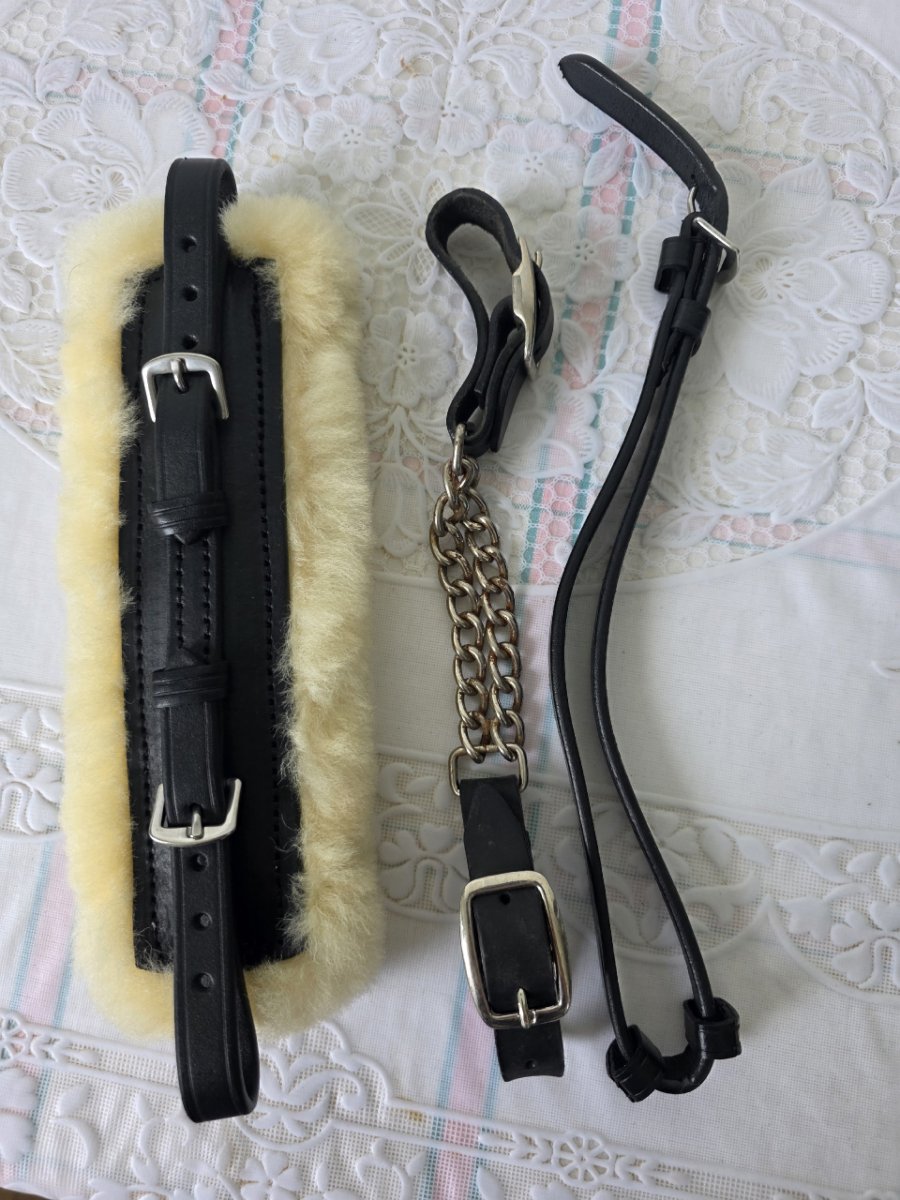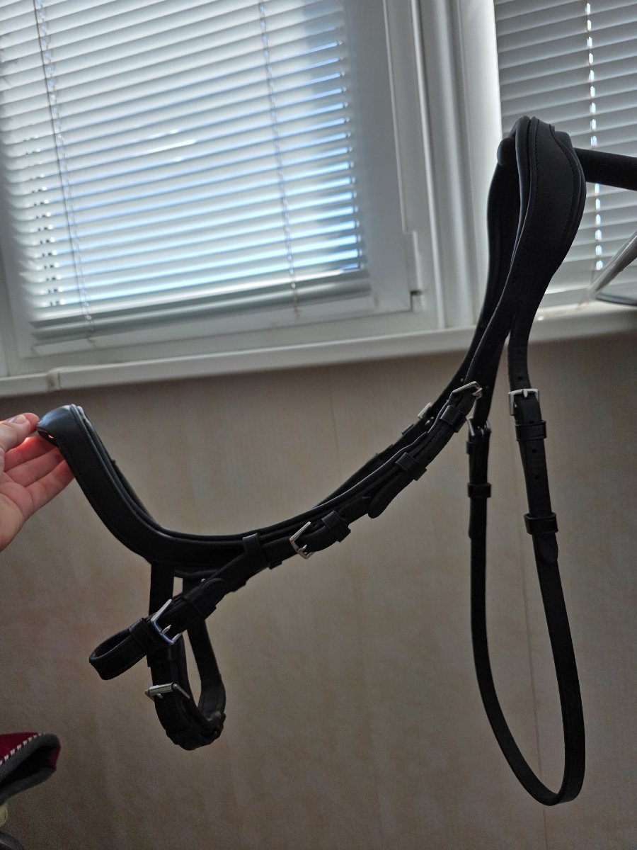 3. Кожаный шамбон с мартингалом, полный комплект: кожаный затылочный, кожаный мартингал для крепления к подпруге, сам шамбон нейлоновый на карабинах. В идеальном состоянии, б/у пару раз, нам не пригодился.