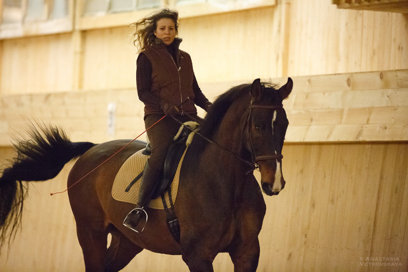 От себя добавлю, что у меня мягкий корпус, руки выше, повод короче. Я берегу спину больную и не верно работаю поясницей, что тоже дает дисбаланс в посадке. Мне самой надо больше сидеть в середине седла, ноги от колен назад. В общем базовые вещи.