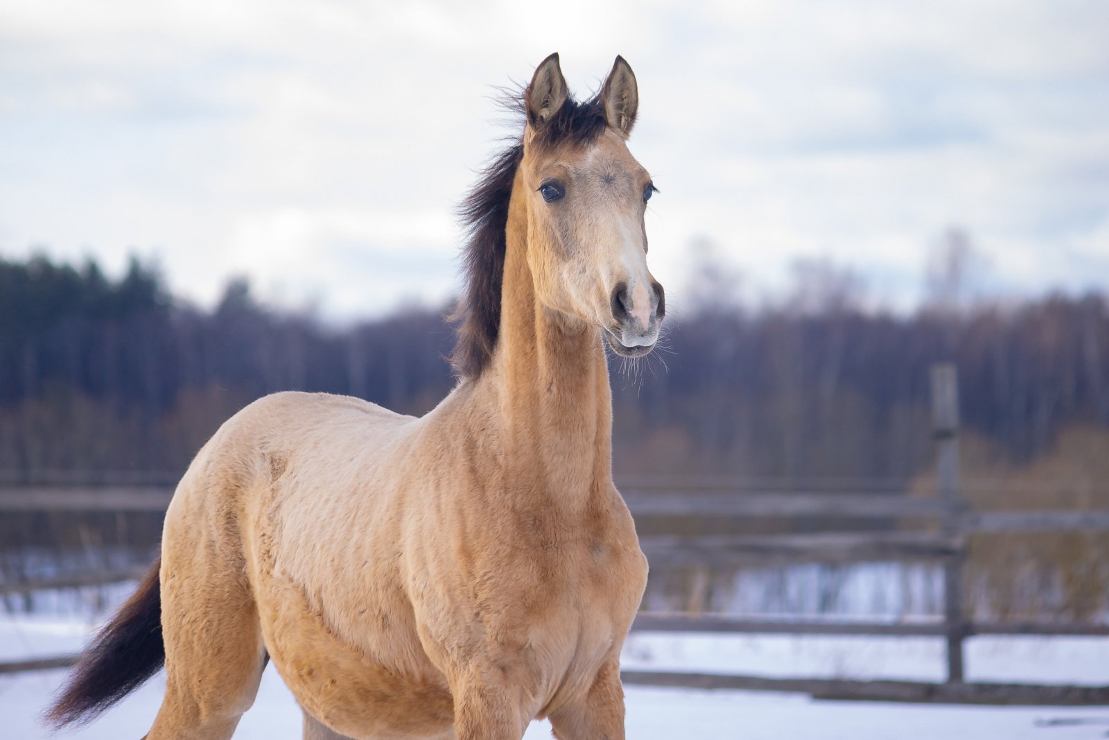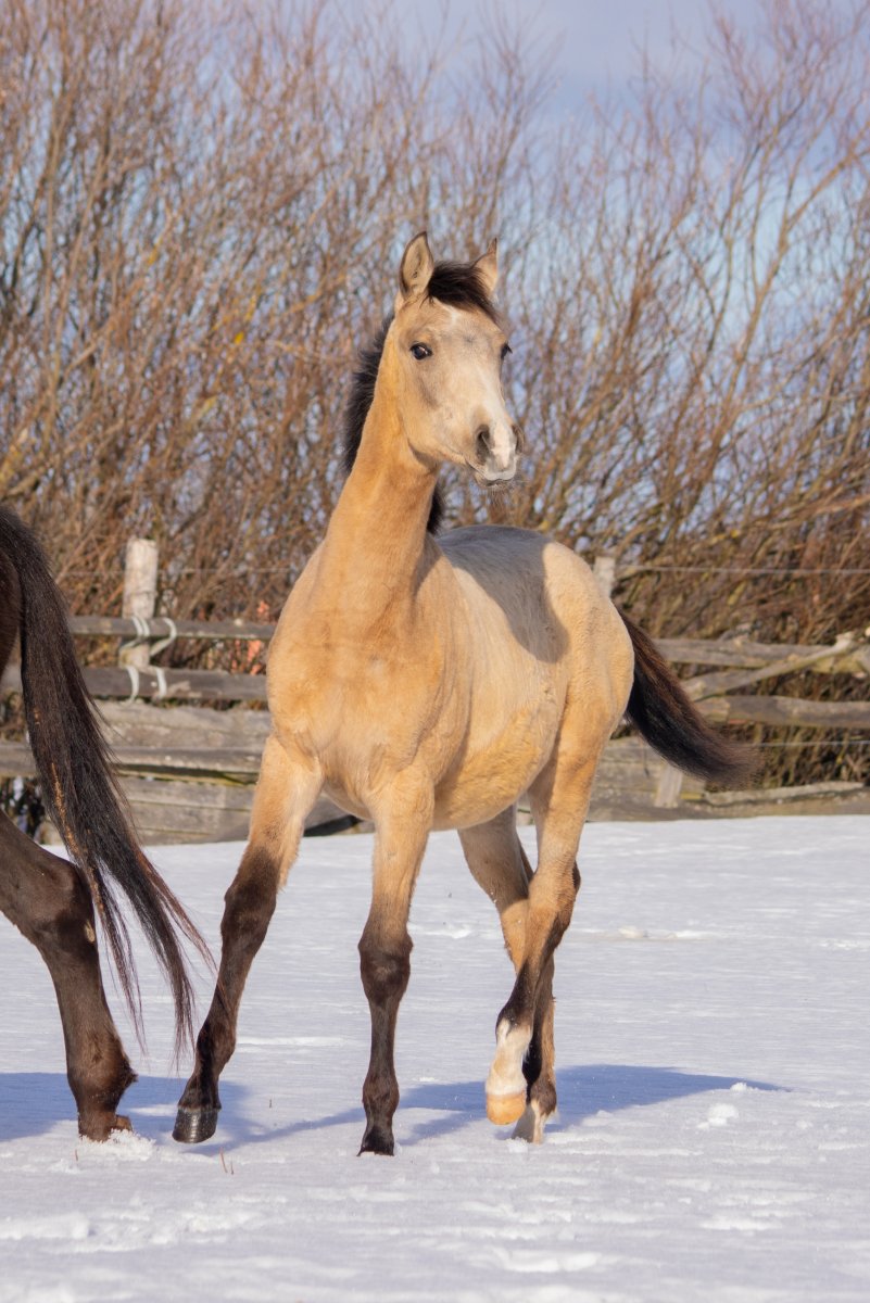 Ахалтекинская кобылка, будет не высокой. Очень общительный и ласковый ребенок. Гуляет весь световой день в большом табуне. Человек-ориентирована.
