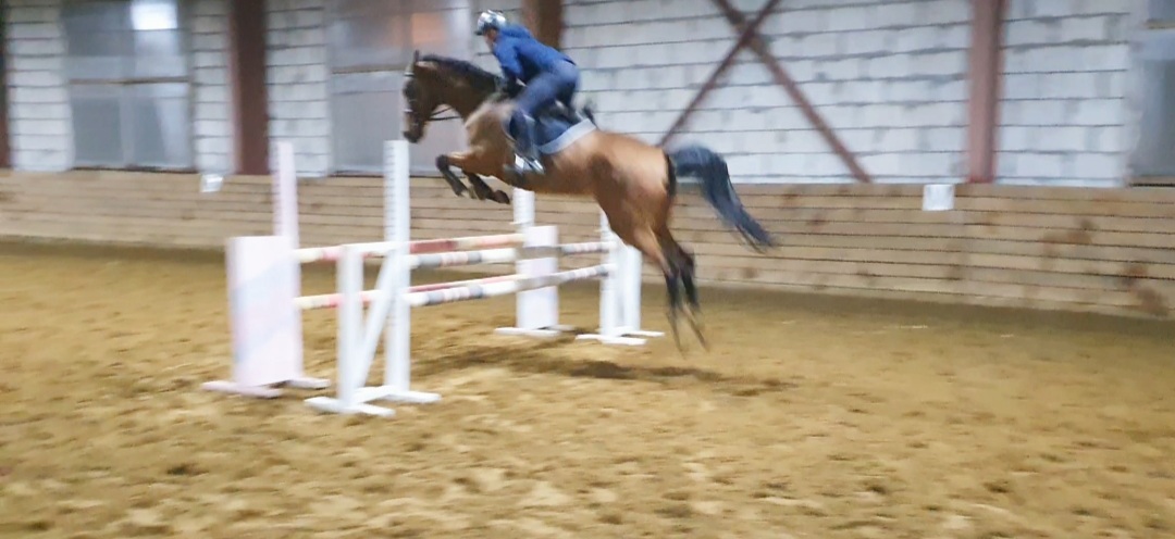 Выступает в конкуре под любителем. На стартах 70-80 см. Дома 100-110. Одиночные 120 (выше не прыгали, нет всадника на эту высоту).