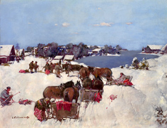 22 августа. У Абельмановской заставы. … Перед тем, как въехать через заставу в заветную Москву, они отдали дань обычаям родной страны. Обычай требует, чтобы джигит, собравшийся в гости к близким сердцу людям, украсил своего коня самым дорогим украшением. На грудь ахалтекинцев и иомудов повесил каждый из них имя своего колхоза, вышитое золотом на алом бархате конского нагрудника. Это имя они пронесли, как знамя, по сыпучим барханам Кара-Кумской пустыни, по мрачному плато Усть-Урта, через казахские степи и пшеничные просторы Средней Волги к сосновым лесам, окружающим Москву.
