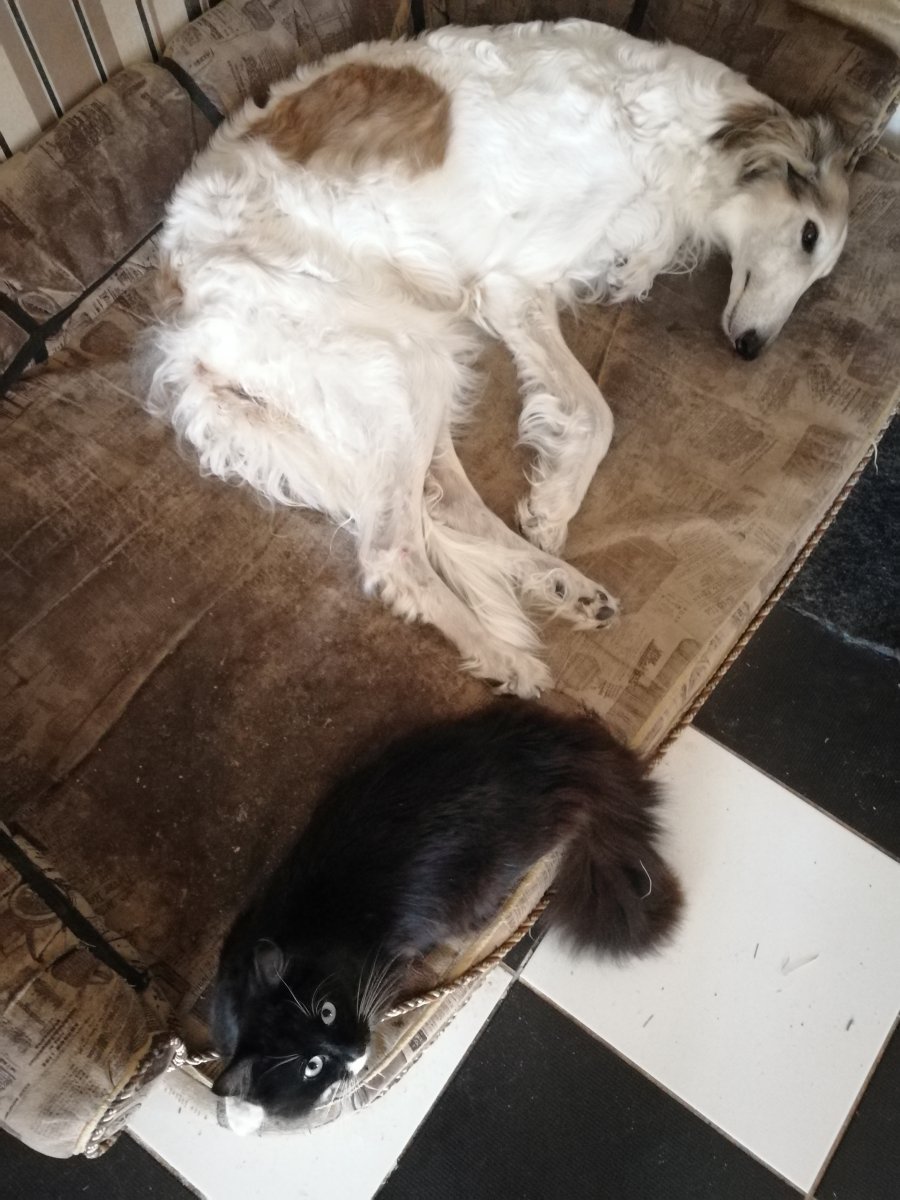 Сейчас у меня Ляка, которую помаленьку выживает с диванчика приблудная беспородь. А вообще она уверена, что Бог создал борзую собаку, чтобы с ней все селфились и гладили по башке. Дружит со всеми - от котов до той самой бордоски.