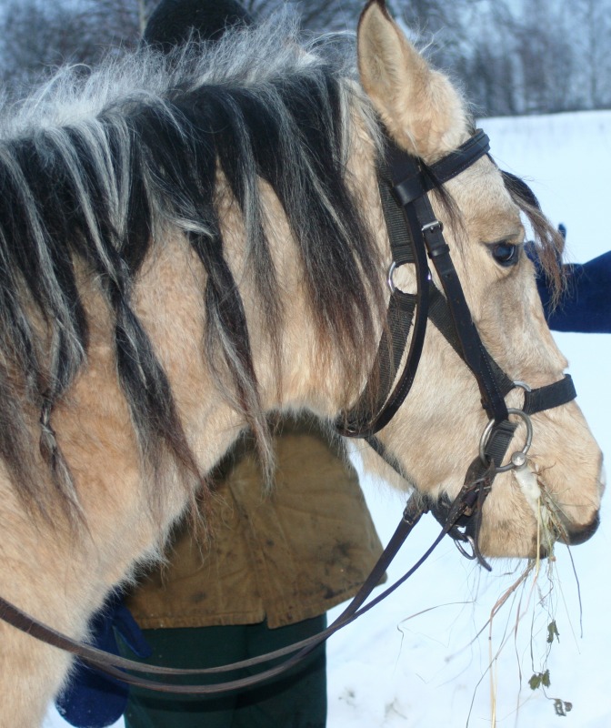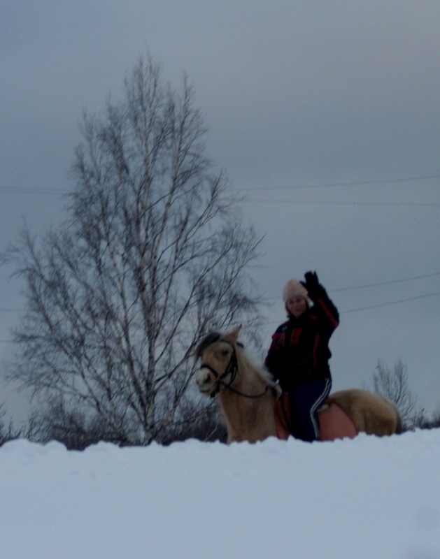 Сегодня я подумала на двух стульях не усидеть. а надо. лошади так привыкли к друг другу. а пора отвыкать. сначала взяла Серебряного поседлала и мы пошагали минут 1 5 дошли до кряковки. познакомились со страшной куклой. бочили но прошли. обратно даже ее понюхали и чуть не укусили. Туда прошли мимо бревна спокойно. но обратно Серебряный решил. что за бревном конеед и как прыгнет в сторону. я чуть не упала. Потом мы пошли в рках шагать. он это делает не очень хорошо. вечно сухарь вымогает. загнал меня в сугроб при выходе из левады. а я его потом