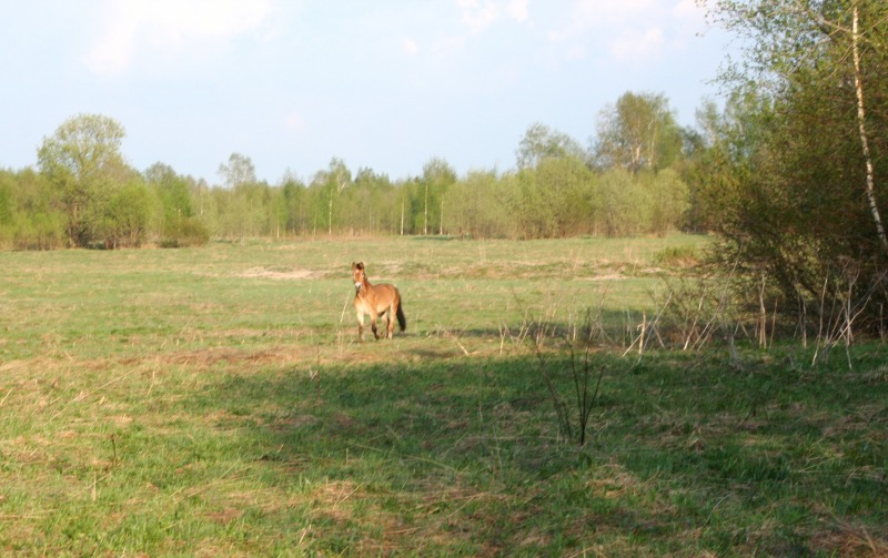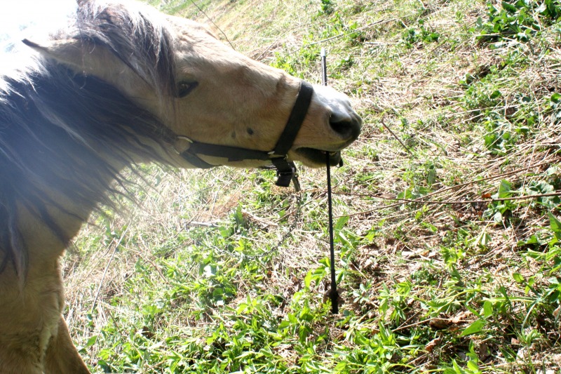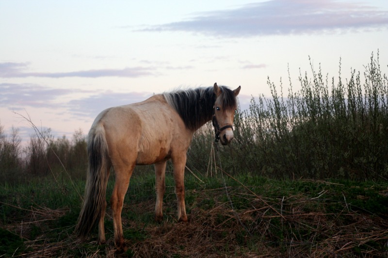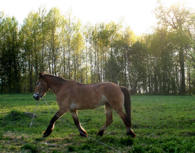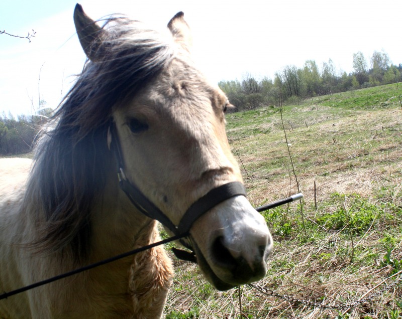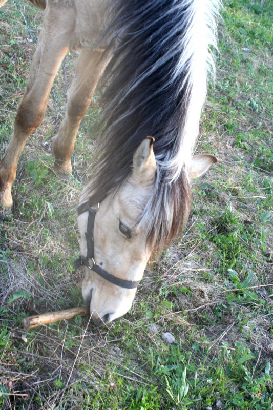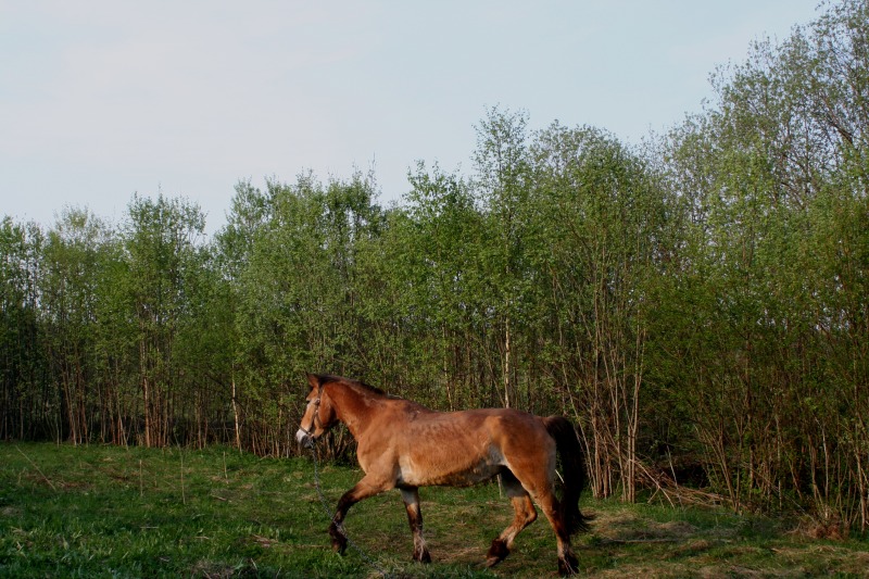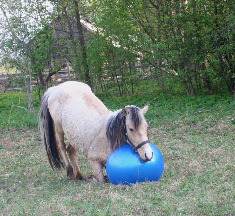 , давление я сняла, т.е дала ему спокойно отшагиваться, по траектории, которая ему нравится и в ту сторону, которая ему нравится, во время шага он тоже облизывался. Отшагался был захвален и угощен кучей сахара и сухарей и почухан, отпущен на отдых. Пошла к Бьянке, почистила ее от шерсти, Серебряного тоже конечно и попробовала подвигать. Точки кипения, я так и не достигла, вскипев сама от жары, Бьянка вяло подвигала булками и прилепилась к траве, просто игноря меня, бич и весь мир подождет, как говорится. Поняв, что я получила полное Фиаско, я побрела к дому вылила на себя ведро холодной воды, покурила, попила соку, взяла мяч, фотик и пошла на поле к Серебряному, Серебряный пооджигал со своим круглым другом. Я косилась с грустью на Бьянку, которая торчала, как всегда в траве, мне хочется ее сфоткать в движении, а она в траве, блин, эта лошадь может есть 24 часа в сутки, есть, спать и ср...