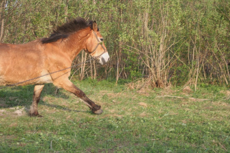 Серебряный наигрался вдоволь, я взяла мяч, бич и фотик и двинулась к Бьянке, увидев мяч, кобыла оживилась я вспомнила, что мячик она мягко сказать недолюбливает. Шла я с целью встать на середине ее цепного круга постоять там с мячиком, пофоткать ее, может мяч наконец у нее вызовет интерес, а не страх. Но именно страх сыграл роль, Бьянка отработала на корде :shock: А дело было так, встала я с мячом с бичом и с фотиком в центр и стала этот мячик по кругу катить и тут началось, кобыла, как начнет бегать рысью, галопом, шагать, менять направления, я только успевала перепрыгивать через цепь при смене направления. Я и не знаю чего делать, у меня голова закружилась, через пару минут, я бросила бич на землю, мячик, который я тоже от страха взяла в руки, Бьянка перешла на шаг, я хожу за ней, т.е за цепью сама остановилась она тоже, я пошла, говорю шагом, она идет, потихоньку толкаю, по очень маленькому радиусу мяч, говорю рысью она рысит, более энергично толкаю мяч, галоп, галопит, опять рысь, шаг, стой, поворачиваюсь другим боком, перекладываю мяч, меняет направление :shock: И в том же темпе в другую сторону переходы, даже сфоткала, отложила фотик, взяла бич, тоже самое, только с бичом и мячом без галопа, работает. Движения четче, подбирается округляется, слушает, меняет аллюр и тоже начинает облизываться, мячик лежит, я хожу только разговаривая с ней и хваля, отшагалась, я мяч отнесла, сухарей дала.Вот и работа на корде, вот и Джой Ап с мячом :shock: , ядреный корень однако. Позже заседлала Серебряного и мы с ним изучали ковалетти, молодец все схватывает на лету, потом пошагали в руках,