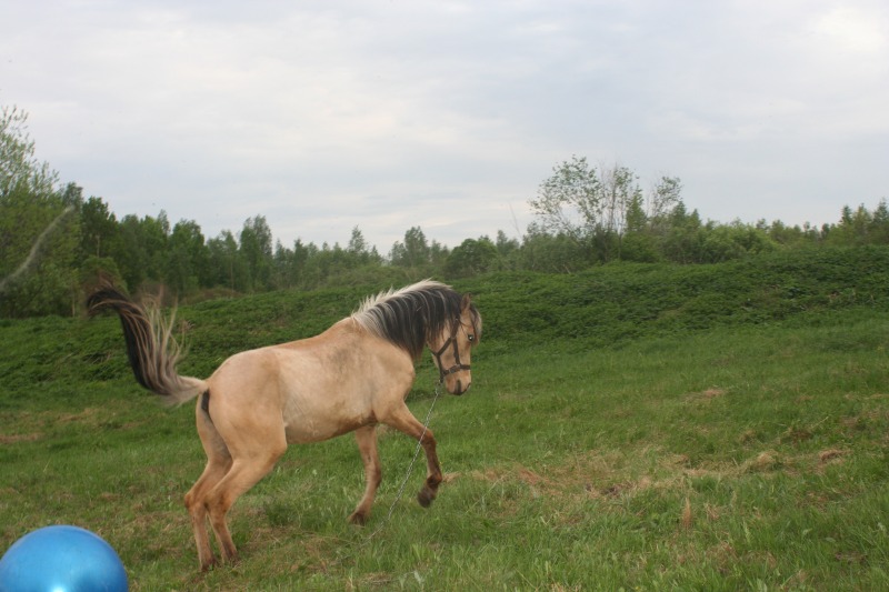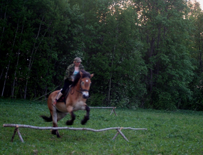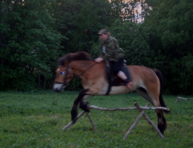 Прыгаем систему из четырех, заходим, как бог на душу положит, то она, то я опаздываем, между барьерами, повороты пока проходим рысью,иногда даже шагом, думаем как поудобнее то приноровится :) на барьер идем галопом, обе без техники вообще, но с желанием прыгать. Не одного отказа, обноса, повала Т.Т.Т., одна задетая планка из 14 прыжков. Да она прыгает охотно, а я бездарность, будем тренироваться иногда.