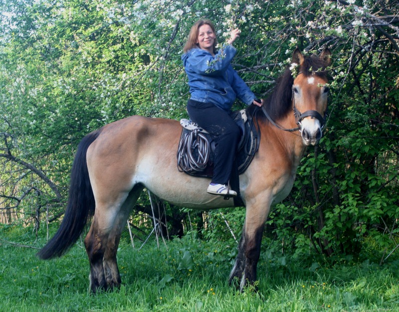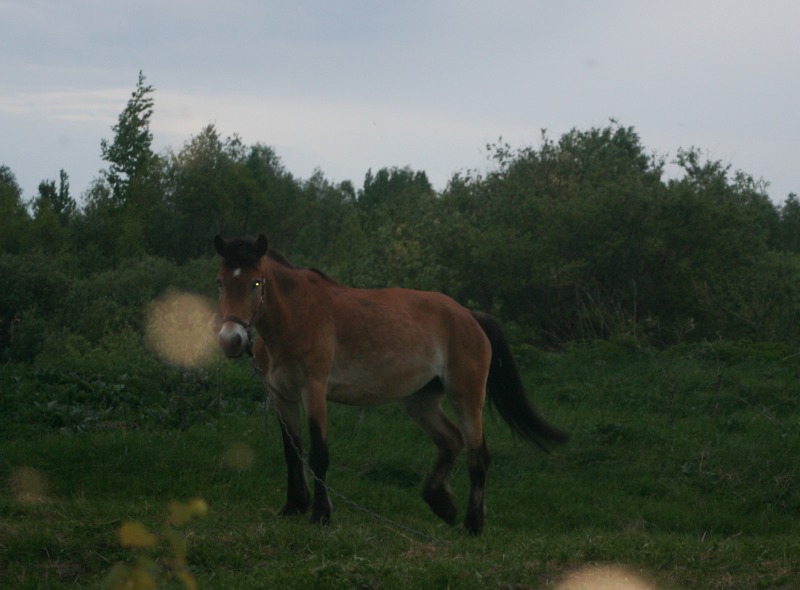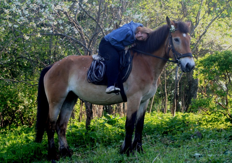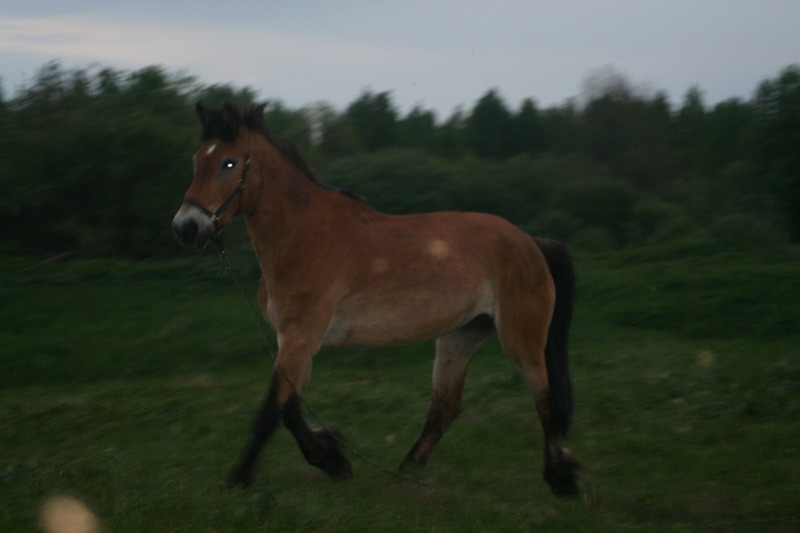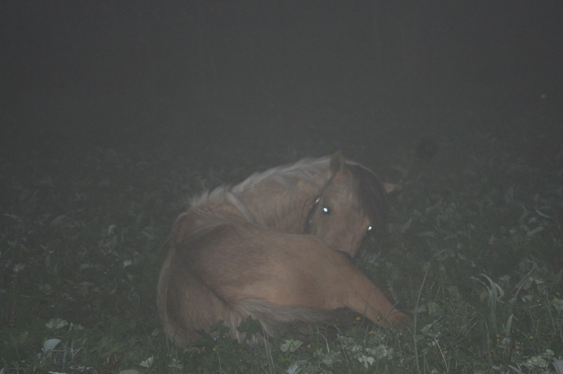 Ладно набегался, нафоткался, позвала, подошел, сухарь в зубы, недоуздок на морду, кол в землю,кушай мил друг. Стемнело, читаю, с фонариком хожу периодически на проверку. Рассвет забрезжил, в сон потянуло, в начале пятого отрубилась, пол шестого, как будто кто то толкнул, встань. Глаза продрала, разум спит конечно, смотрю в окно и вижу, картина маслом :shock: .Только не приплыли, а покрыли блин, опять судьба им шанс дала, карабин расстегнулся у Серебряного. Ну ладно думаю, если вертухи ломаются, недоуздки снимаются, карабины расстегиваются и правда судьба случится любви. Во общем процесс закончен,стоят нежно друг друга пощипывают, прям любо дорого смотреть, еще бы спать не хотелось. Пытаюсь их привлечь внимание на себя, сначала пряником, т.е овсом, потом кнутом, т.е бичем, ноль внимания фунт презрения. Я прямо около них стою, на расстояние пол метра, ни каких вообще эмоций в мой адрес , все цельно поглощены друг другом, опять инстинкт основной позвал, я застеснялась и ушла в дом. В конце концов инстинкт пожрать овса у них когда нибудь проснется, спать хочется до апупения, но думаю, пока Серебряного не посажу отдельно, не успокоюсь. Все здесь кобыл на привязь сажают, а жеребца во время случек на свободу, кобыле свободу лучше не давать, они уводят и будешь дня два по поля за ними скакать. Все да, но мне не спокойно было и я решила позавтракать, сижу ем, одним глазом в окно зырю, стоят милуются, пощипывают друг, друга. И вдруг Серебряный падаем, я босиком по росе, так сказать, бегу смотреть, что такое. А эта паучиха, с горяча я так кобылу назвала, опутала своей паутиной, т.е цепью, ноги героя любовника и он упал, окончательно запутавшись. Как я испугалась, издали смотрю ни чего не повредил, подхожу, он пытается встать, не может. и даже писается от страха, а эта модам на меня крысы, мол не трогай моего мужика. Мой мужик и точка, что хочу то и ворочу, я ей дура ты кобыла, совсем свой мозг в охоте потеряла, стой не рыпайся. И пробую распутать парня ни как, отстегнула карабин, в одной руке кобыла, другой распутываю бедолагу. Все распутала и он гнать со страху, кобылу быстро обратно на цепь. Пошла искать бедолагу, но он оказался настоящем мужчиной, столько испытаний перенос и нет что бы от страху бежать куда попало. Нет он добежал до Фольца и думал уже, чего бы там тюненговать. Я ему объяснила, что Фольц и так мной и Хребтовской дорогой изрядно тюненгован и ему не стоит даже об этом думать,во общем планы я ему обломала, прицепила пастись и спать.