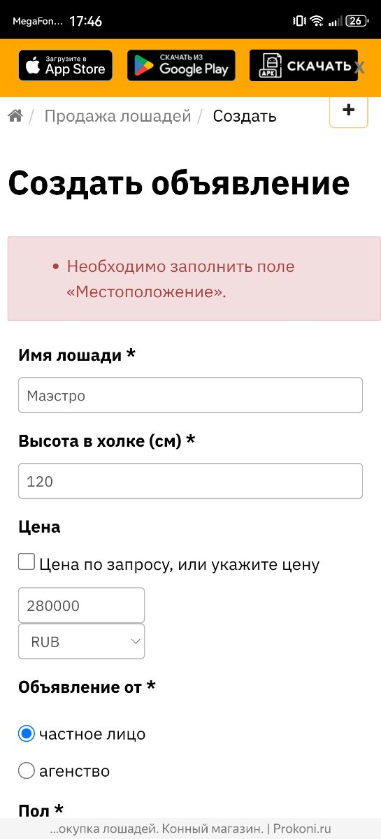 Здравствуйте целый день пытаюсь добавить в продажу в объявление лошадь, мне выдает вот такое хотя я указываю Москва, и слетаеттвсе вместе с загруженными фото, не могли вы бы мне помочь с размещением?