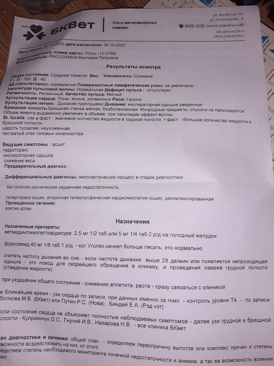 Насчет откачки жидкости, когда говорила с кардиологом, она сказала, что если этот процесс начался, какое то время на откачка можно протянуть. Но накопление жидкости будет продолжаться. То есть, откачивать придется периодически, и жить недолго. Но есть звери, которые откачиваются и живут годами.