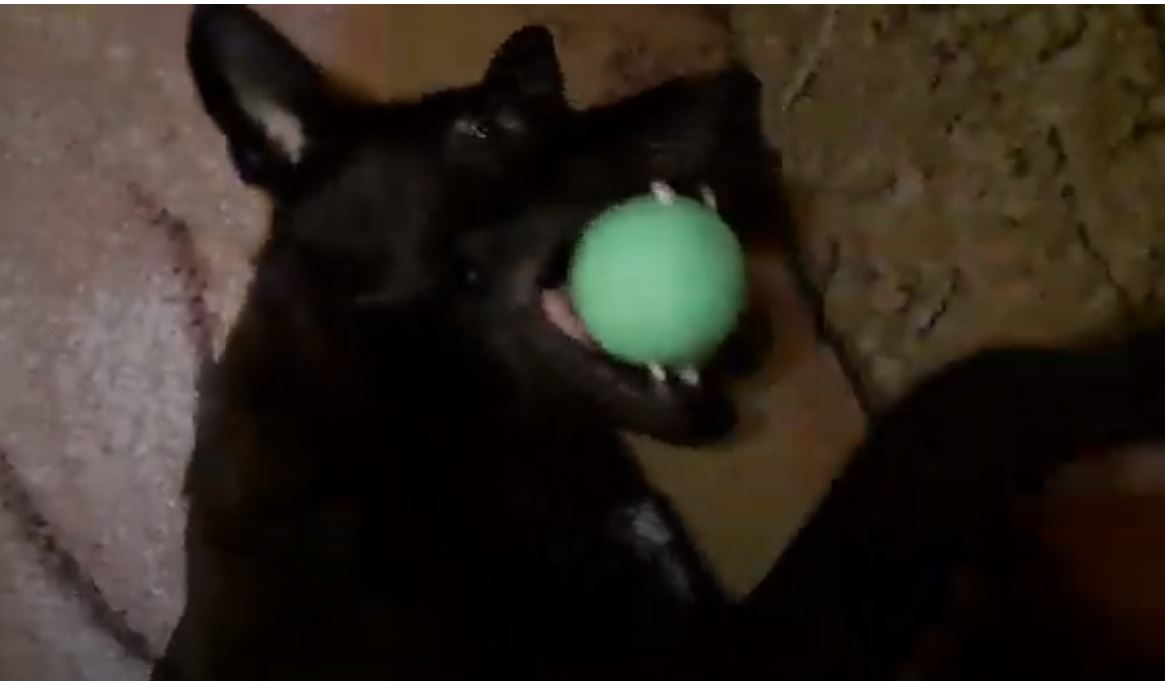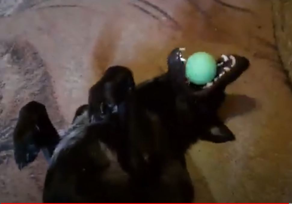 У Чани есть два мячика из цельной резины. Черному год и он уже основательно погрызен, не катается, а зеленому месяца три. Вот с зеленым Чайничек носится, как кошка. Сама подкидывает, лапами ловит, гоняет по квартите, а устав, кувыркается с ним на полу. Но, зараза, пока я расчехляюсь это заснять, все уже закончено!