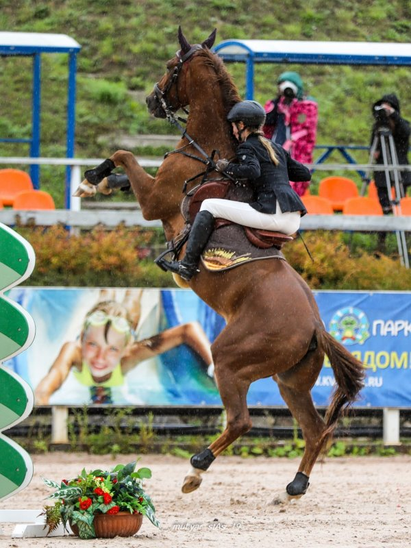 Это мой Бюшики и я ) и это лошадь, которая НЕ свечит - а тогда он просто весь маршрут прошел вот так - на задних ногах. И каждые старты я не знаю, чего от него ожидать, потому что у меня куча историй, когда я не могла войти на нем на поле, когда не пересечь даже линию старта (а после снятия - он сразу такой - куда ты хотела? пойдем!), когда он не двигался - а после колокола - потащил, когда тащил - а после колокола загасился, когда ловил на простейших барьерах, когда, когда, когда...