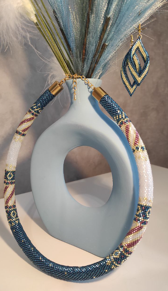 На днях закончила масштабный проект. Очень тяжело мне далось и колье и серьги. Серьги вообще в этой технике делала первый раз по мастер классу на Ютубе. Возилась с первой 4 часа, чтобы закончить вторую в срок пришлось завести будильник на 4:20 утра и делать до работы, т. к. сильно горели сроки. Фух, даже пофотографировать получилось :D Вывесила на Авито в портфолио сильно дорого, чтобы больше не повторять. Возни было просто мрак)))