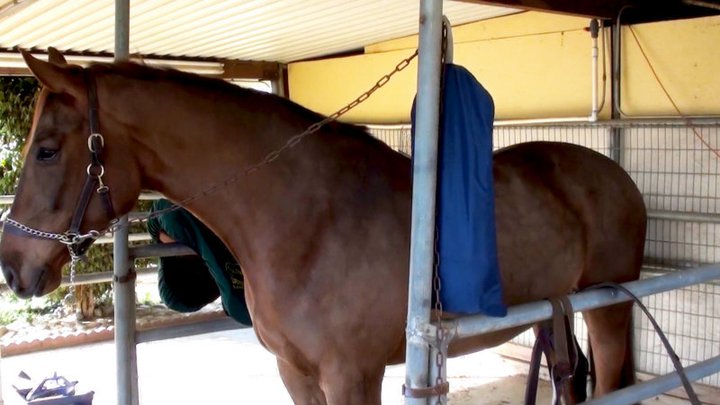Эта кляча стоять не желала, я чудом застала в 18 ч в конюшне одну даму, пока солнце не зашло- попросила ее подержать, так она с ним боролась все время, несмотря на то, что я его в манеже отгоняла полчаса. Да еще и темно было... Вобщем, что получилось - то получилось:
