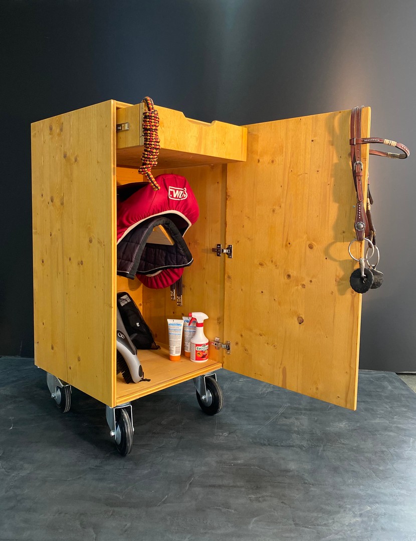 А есть еще у нас одна лошадка 25 лет, на пенсии, к ней приезжают хозяева раз в месяц и ездят на прогулку уровня лайт, так у них вот такой шкафчик-самодел, очень удобно, я считаю ( привез из амунички, достал что надо, после все убрал и в угол амуничника задвинул, и внутри все чистое и мыши не бегают):