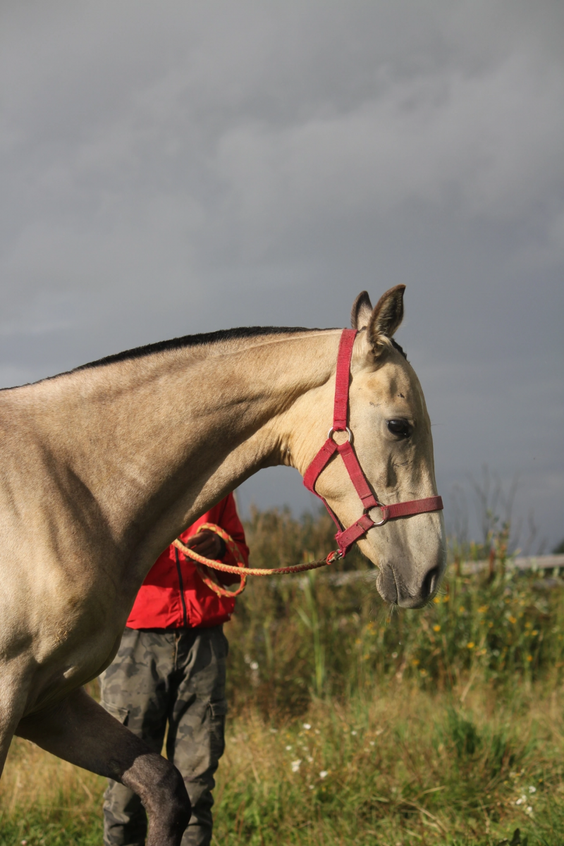 Ахалтекинская кобылка. Очень общительный и ласковый ребенок. Гуляет весь световой день в большом табуне. Человеко-ориентирована, на хороших легких движениях.