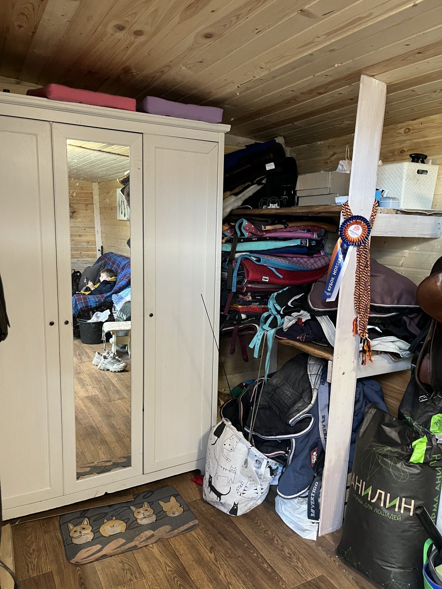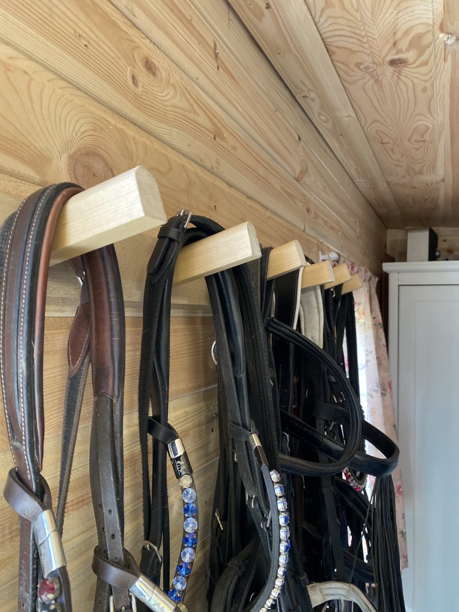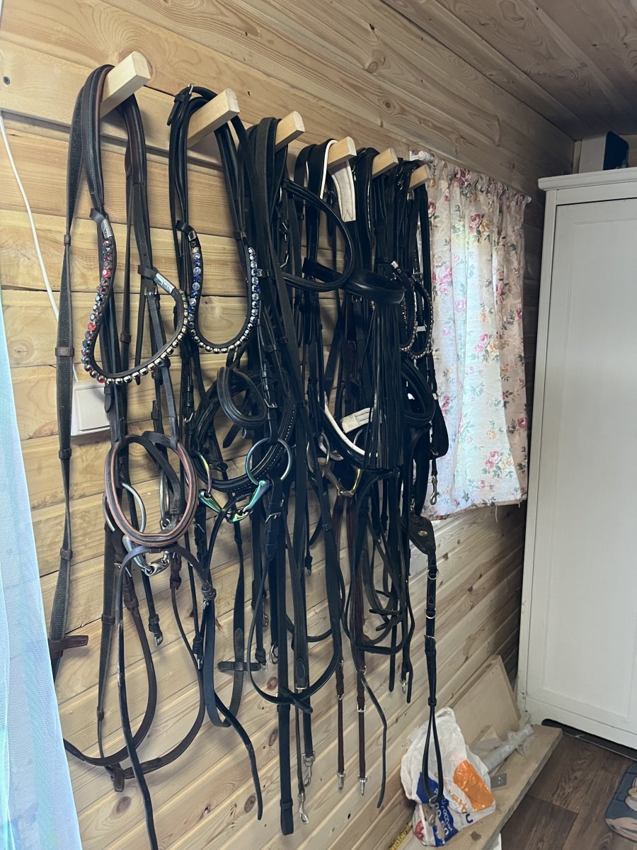 9 кронштейнов для сёдел, 3 больших полки под вальтрапы и попоны, крючки для уздечек и тд.