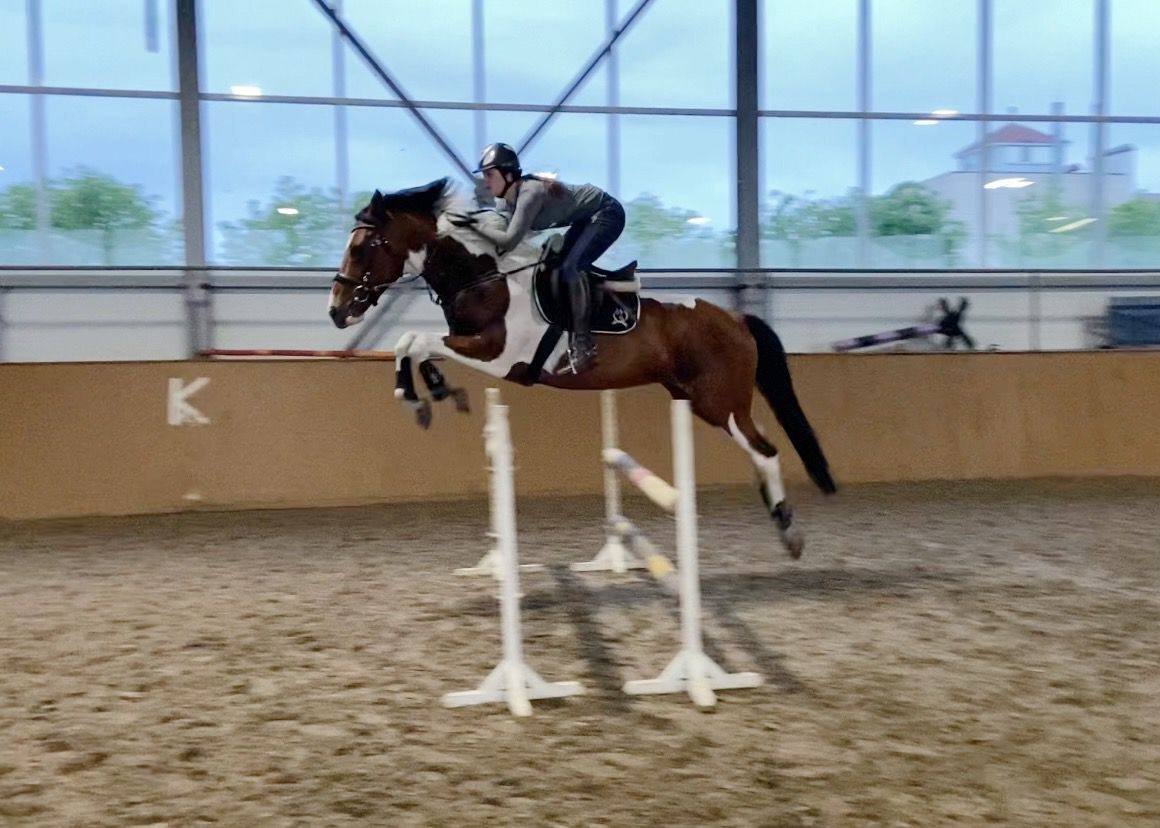 Мерин спортивной помеси (тракен+ РВП), пегой масти.