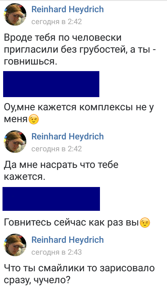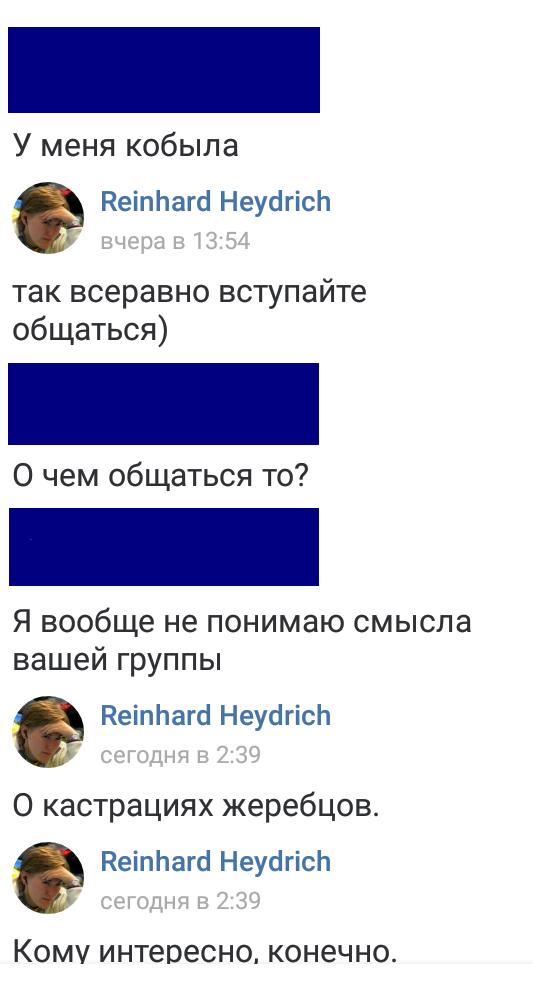 Подруге ночью написал. Пригласил в группу. Она ответила, что у нее кобыла. Дальше все в скринах.