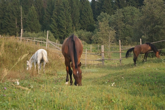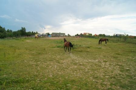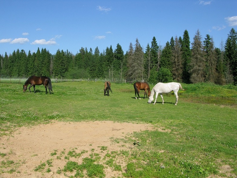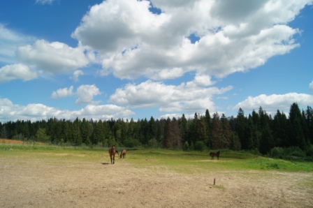 Левады, леса, поля , реки. Сено , трава вдоволь. У каждой лошади свой рацион. Плац песочный боронится.