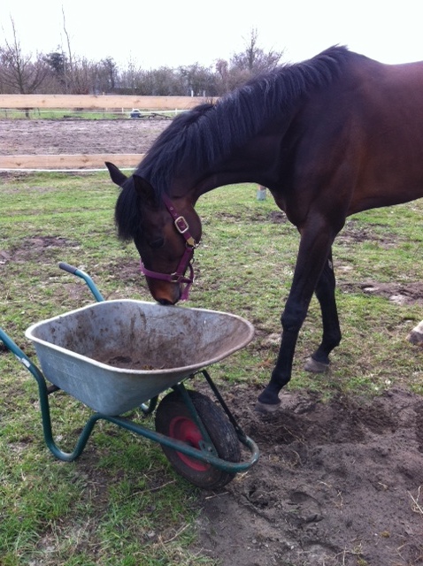Оставила его в леваде, пошла за тачкой. Бардо очч тачке обрадовался, ходил с ней вместе по леваде и следил как в ней что "разложенно". Еще заинтересовался граблями, ну я изверг, сразу начала его всеми сторонами граблей "тыкать" . Он правда особо против не был, стоял смотрел недоуменно.