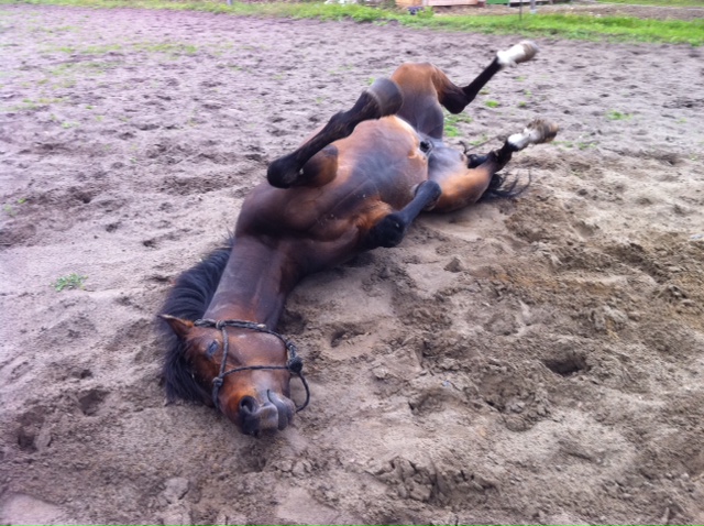 Погуляли часик по полям. Туда шли нервно приплясывая, но вежливо. Просто ему очень бегать хотелось. Вел он себя как жеребенок, делал вид что боится всего, на все фырчал, а еще раз шел шел и... упал. :shock: Вот прямо посреди дороги и завалился!!! Песочек ребенок нашел, грех не нырнуть в него. Вот вам и "лошадь ложится только в знакомом месте"...Нифига, ложится да еще и лапки задирает посреди дороги...