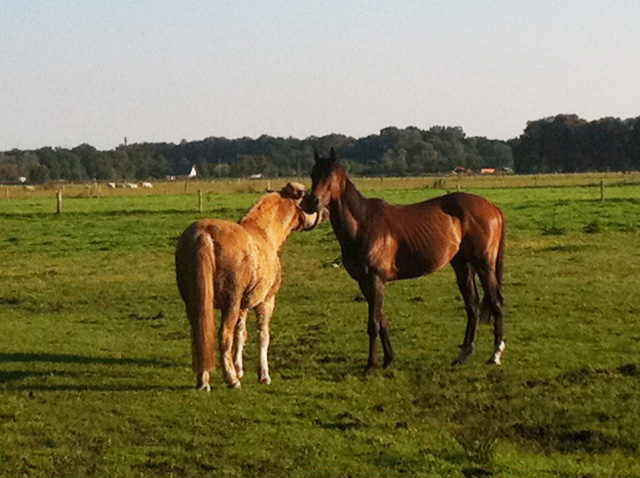 На выпасе Бардо нашел себе первого друга, старого (бывшего конкурного) поня Султан. Теперь они холят вместе и Бардо часами снимает с Султана маску от мух