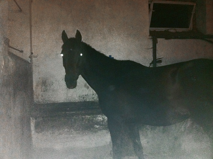 По выходу с плаца, лошадь сказал "ой, а тут я не умею" и струхнул... Опять навел на меня уши, весь зажался и мини-шажками пошел притираясь к боку Портоса... Но через 10 минут его отпустило и он начал фыркать и даже обгонять Портоса на шагу. Весь такой спокойный, как танк. Дошли до леса. Там я хотела слезать и обратно вести в поводу (так как Портос там начинал рысить, а мы это уже делали), но мы встретили 2х других "наших", как раз направляющихся домой. Я решила просто повернуть и дойти с ними. Те двое только что делали галоп и были еще очень на взводе. Может сказалось это, может то что те лошади были одного ранга с Бардо и он не чувствовал себя с ними уверенно, но обратно он шел ХУЖЕ. Намного. Нет, он все еще шел заданным мною шагом, но дерганым и с задранной а ля "йа- скакаш" башкой, приплясывая по обочине. Хотя даже трактор пропустил мимо, не испугался. Мне не понравилось очень что он вспомнил такую манеру ходьбы, но порадовало что он остался "со мной" и духом и ушами и что не ругался на мои поправки. Кстати когда мы выехали первыми, Бардо вроде успокоился и пошел нормально. Может ему не понравилось сзади "равных по рангу" идти, фиг его знает.