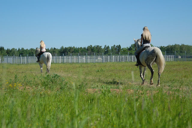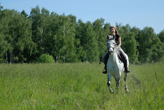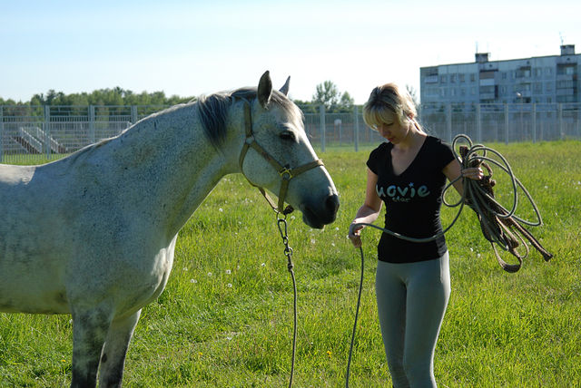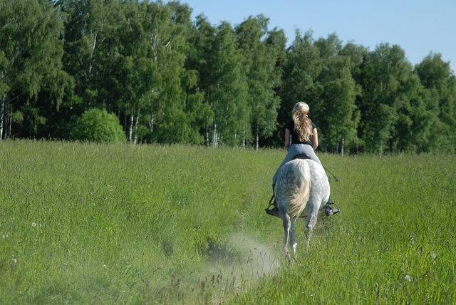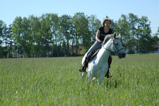ну, я как всегда помудрила со стременами, ну не нравятся мне эти путлища! на них дырки не равномерно продырены! и вечно у меня проблемы поэтому...ну Ира естественно неприминула сказать, что я копуша этакая, должна была уже сидеть и шагать, а я тут стою и фигней занимаюсь...ну да ладно. сели, пошагали, начали рысить. потом делали подъемчики шаг-галоп-рысь-шаг-галоп по команде. первый подъем по команде у меня не получился, причем понимаю, что я виновата сама, надо было хлыстом подработать, но я решила все пустить на самотек, в результате получила в переносном смысле по башке и потом была уже более внималельна и вроде все получилось...но по правде сказать заслуга была в этом не только моя, но и Тунгуза, т.к. он уже все понял (в каком месте галоп нужен) и поднимался самостоятельно, как только я садилась на учебную рысь. а вот с ней, с этой рысью у меня до сих пор не ровные отношения...не на всех лошадях она у меня получается(( и к тому же если темп меняется, то я могу сбиться, а во вторых я так сосредотачиваюсь па работе позвоночником, что ногами досылать не могу(( раньше правда была еще проблемма и с руками (я сразу распускала повод)