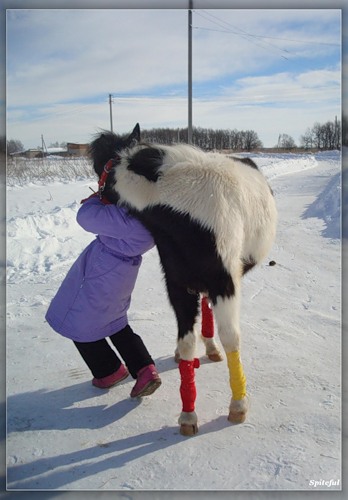 Далее забинтовались, ибо у лошадки рахит на задах (иксом), а на дорогах скользковато было... Зная Нюшу, которая может в любой момент сорваться с места и бежать без разбора дороги, решили, что лучше подстраховаться, чем потом она растянет себе, не дай Бог, связки, шлепнувшись где-нибудь на скользкой дороге.
