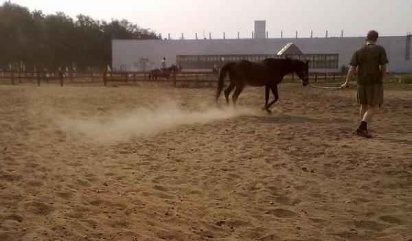 После долгого перерыва дошли к нам "в поле" - в смысле на круг. Немного погулял спокойно, потом начал снова прыгать как я не знаю кто... И отбиваться. Не могу понять - слепней вроде не было. То ли я их не видела, то ли он по привычке. Зрелище было конечно отпад. Конь стоит и лупит ногами в воздух в разные стороны))))) На всякий пожарный ушли к конюшням. Пассажем и пезадами в руках :mrgreen: Дело было к вечеру, надо еще днем вылезти туда - хоть точно буду уверена, это оно птичегггг местных мочит или так))) Разминаецца перед общением с любимой хозяйкой))))