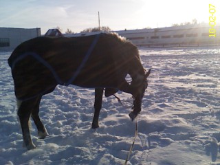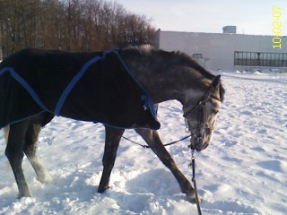 Потом мы ходили гулять. По территории. Пошли машин пугаться, естессно. Залезли в сугроб))) Поросенок это, а не лошадь. Правда, первая попытка пойти гулять закончилась попытками подкрепиться моей курткой. Так что пришлось вытащить еще раз на кордовый круг, типа куснул - пошел бегать. Шамбон уже сняла, и без него держал голову чуть выше, чем хорошо бы, но так энергично шел... Красиво даже местами. Было бы. Он как-то... Недостаточно спину округляет. Шею поднимает, но не так, как надо бы...