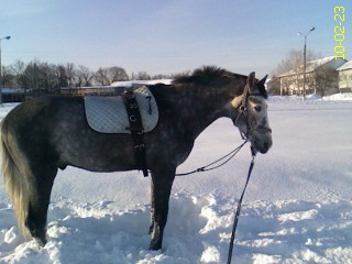 Поля пока немного не наш вариант - ему под седлом комфортно пока только шагать, и то недолго. Первые может минут 10 он хорошо идет... Потом начинает уставать спина. А рысь вообще не несет пока вес человека - сразу прогибается оленем... Так что на долго под верхом не уедешь. Но зато у нас есть плац большой, хорошо засыпанный снегом, очень хорошо. Ездят в основном все в манеже, так что там снег долго не приминается. Вот там вот мы и работаем на корде, плавно смещаясь, чтобы постоянно по глубокому бежал, не вытаптывал тропинку. Вообще видно, что бежать ему тяжелее, чем по обычному грунту, ноги "выдергивает" оттуда - так что конечно это не сугробы, там слой может см 15 будет, но все равно.... Стараемся именно по снегу работать