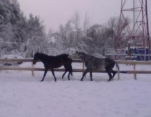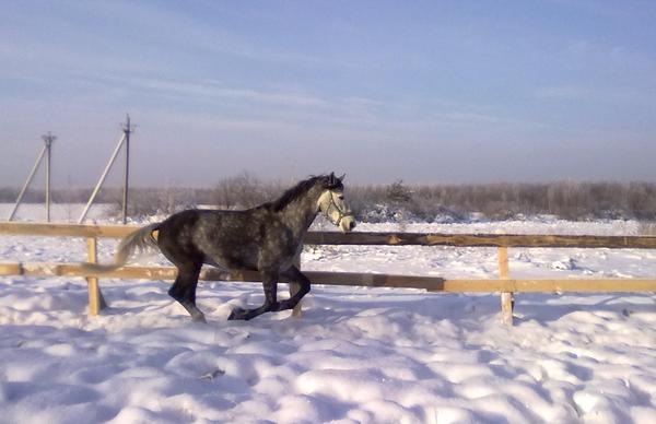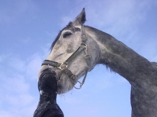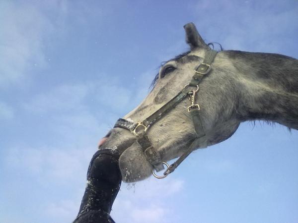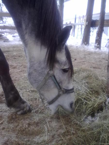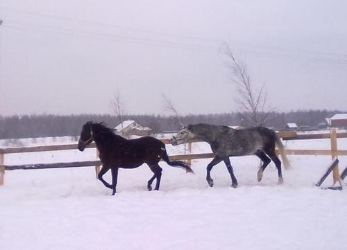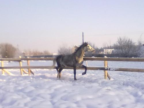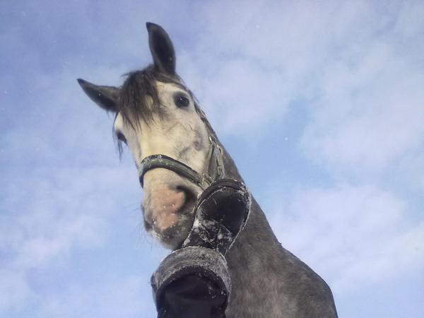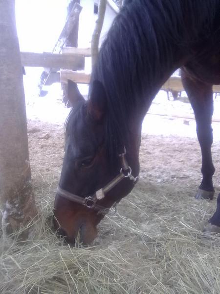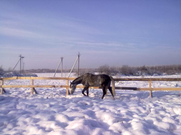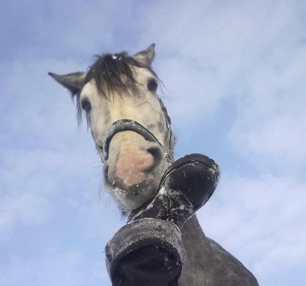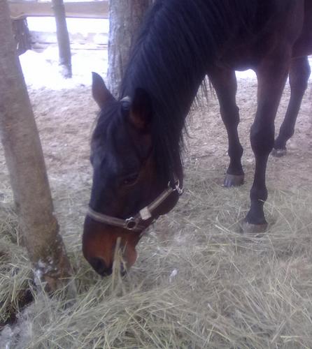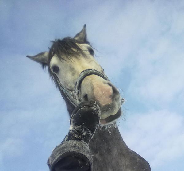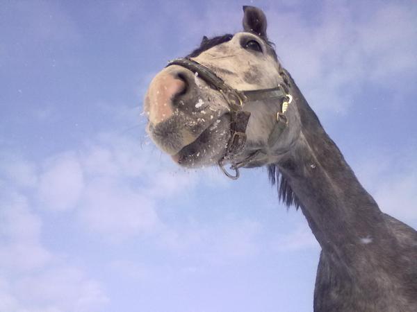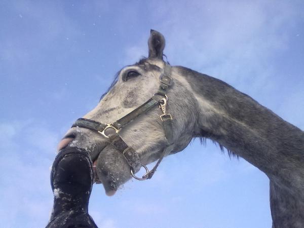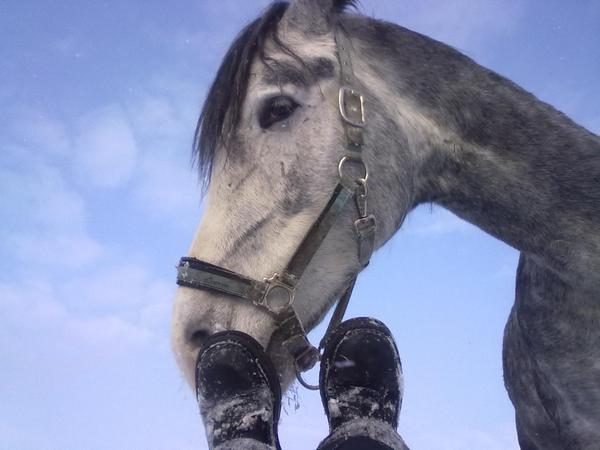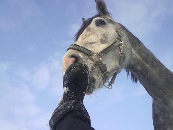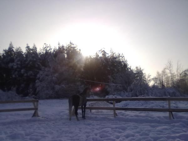 Ну для начала просто так, в леваде морды. Вот такой на самом деле красивый Вжик. Он вообще плохо на фотках зимних выходит, какой-то темный и все. На самом деле у него очень красивый яркий шоколадный цвет, очень приятный гнедой, нарядный такой, насыщенный... Но когда все вокруг белое, он засвечивается до просто темно-коричневого и все.