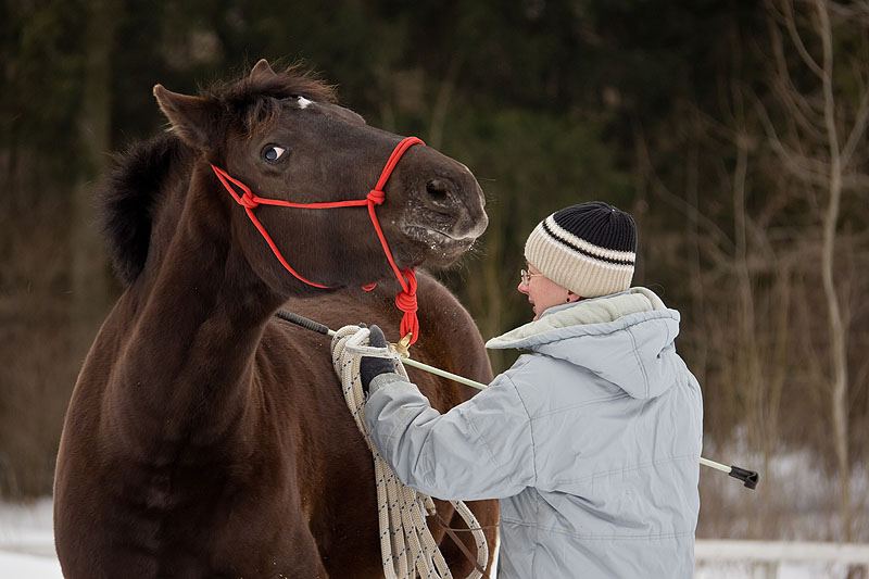 Переучиваться всегда сложно... :roll: А когда еще для тела действие абсолютно логично(тянем влево-лошадка поворачивает влево) то это еще сложнее) Большинство людей, которых я наблюдаю(а это не выезюки) бросают внешний повод... Я в их числе, собственно говоря)Умом, например, понимаю, что поворачивать нужно больше внешним поводом, но всё равно зацикливаюсь на внутреннем.