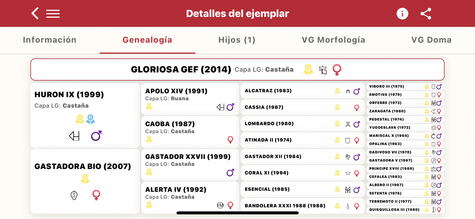 В родословной есть самые значимые исторические производители, чьи линии стараются продолжать испанские заводчики! Родословная звездная, стоит изучить. По шкале расположенности к выездке, стоит коэфициент 108,1, в России выше только у ее матери и они идут с большим отрывом от остального поголовья!