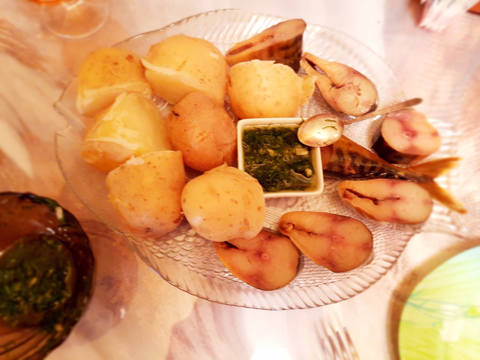 Скумбрию порезать/почистить, картошку с маминого огорода отварить, укроп-чеснок мелко порубить, с маслом перемешать. Съесть за здоровье ментов??