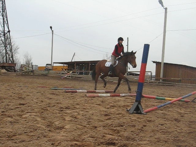 И в конце попробовали прыгнуть (а точнее, перешагнуть) маленькую крестовинку с кавалетти. Если бы Геля ее не прыгала, было бы гораздо лучше. (На таких высотах, всаднику "прыгать" не нужно, достаточно просто оставаться в динамическом равновесии с лошадью, сохраняя полевую посадку).