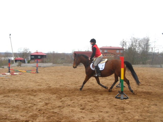 Потом упражнение на повороты. На траектории большого вольта ставится 2 пары воротиков, и всадник должен выбрать такое положение тела (на полевой посадке), при котором лошадь сама остается на этой траектории (без дополнительного заруливания). Упражнение выполняется на шагу, рыси, галопе. Ну чтож, яйцо МТС - наш томатный спонсор :(