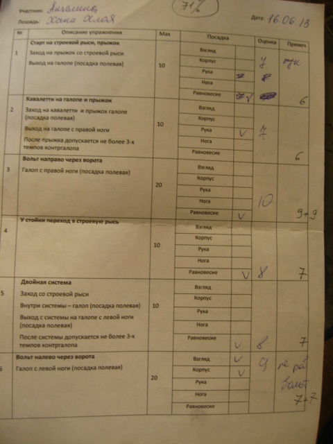 Немного по принципу судейства. Оценка ставилась за общее впечатление от выполнения упражнения. В графах посадки отмечались ошибки (т.е.то, что было во время упражнения не на месте). При подсчете за каждый отмеченный пункт посадки от результата отнималось по 1-му баллу. Потом считался итог и процент. Задача была проехать больше, чем на 50%. Они ее перевыполнили. Молодцы! :D