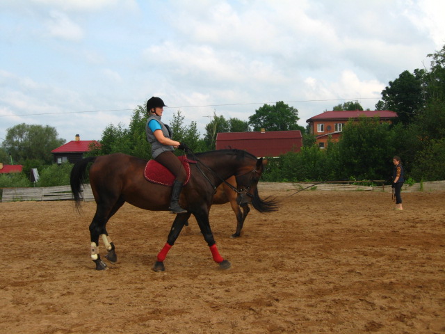 Ира со Стешей, как было написано выше, радостно стерлись, поэтому работали без седла. Работали как обычно, ничего нового: улучшаем рабочие аллюры, делаем предварительные упражнения к полупируэту на галопе, отрабатываем одиночные менки слева направо.