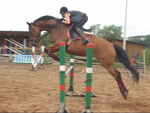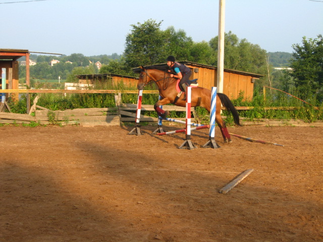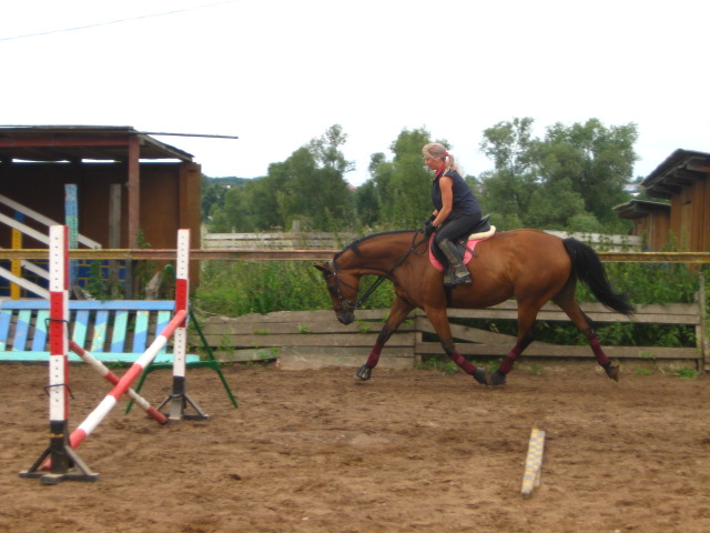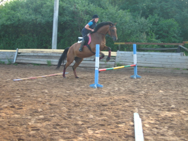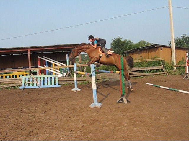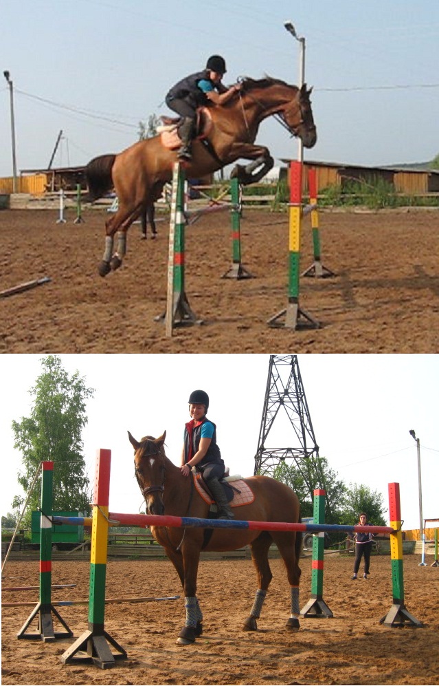 Кобыла еще неподъезжена, плюс она "зажигалка", и на любую отдачу повода выстреливает вперед (даже во время прыжка), поэтому пока удивляться отсутствию техники прыжка и прыжкам "оленем" не стоит :wink: