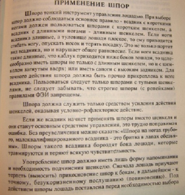 Основная ошибка, когда шпорой пользуются при ноге в том же положении - не верно, ногу надо развернуть, чтобы шпора заработала, а такое использование шпоры не допустимо, ибо тогда пятка едет наверх. Что касается ноги на галопе, то ее надо тянуть вниз-вниз-вниз, если стремена велики, то это значит, что нога на галопе закрепощается и тянется вверх, а не вниз. Начинать на галопе можно с того, что тянем ногу вниз, вниз носком, конечно же без стремян, когда нога устаканится, то поднимаем носок вверх, но помним о ноге вниз. Ну и повороты-наклоны-жонглирование - все это для того чтобы раскрепоститься в седле.