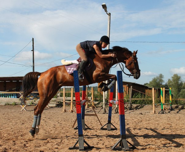 На самом деле у них проблем 2: у коня нет базы, с которой можно работать. Должно быть как: конь уже все умеет, остается только плавно перевести его с уровня на уровень и вторая проблема Катя пока не сидит стабильно на выездковой посадке. Но, что смешно, это вытекает из первой проблемы: конь очень зажат (2-я ступень шкалы тренинга :wink: )- не работает спиной- поэтому на нем и сидеть неудобно. Поэтому эти несколько занятий мы посвятили раскрепощению лошади и постановке перед поводом. Я, честно скажу, такого прогресса у них не ожидала. В середине рыси после моего любимого упражнения с серпантином и диагоналями лошадка расслабилась, стала более пластична и ритмична, стало намного меньше сопротивления. Вторую часть рыси мы посвятили разбору ППЮ. Нужно добиваться того, чтобы в езде один элемент вытекал из другого, являясь его логичным продолжением. Вот над этим и работали. Но пока без боковых, которыми плотно займемся через занятие. Ну и конце, как обычно делали реприз рыси без стремян, посвященный выездковой посадке. У Кати основных проблем в посадке было 2: во-первых, она неплотно сидела в седле (не "прилипала" седалищем к седлу), а во-вторых, она ехала слишком расслабленно, поэтому все части тела (бедра, колени, руки) летали по совершенно причудливым траекториям. Сейчас это практически ушло. Нужно сказать, что Катя - герой. Недавно родив, она уже полностью выкладывается на тренировках, в результате чего прогресс идет просто семимильными шагами (3 раза тьфу!!!).