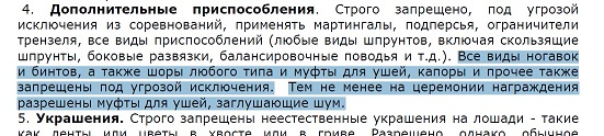 Ржавая Дикая права. Они глушат резкие звуки, особенно в крытых помещениях. Насчет конкура не помню: нет под рукой ФЭИшных правил, а в выездке стюард имеет право проверить наличие/отсутствие беруш под "ушками".
