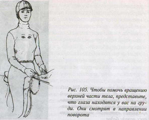 Полезное упражнение. Остановите лошадь, бростье стремена и поразворачивайте таз из стороны в сторону. Обратите внимание, как ведут себя ваши бедра. При развороте вправо, левой бедро будет уходить назад (а тем самым автоматически давая команду на боковое). Не надо елозить по седлу, представьте, что у вас в позвоночник вбит шест, который прикрепляет вас к седлу. Вот и вращайтесь вокруг него.
