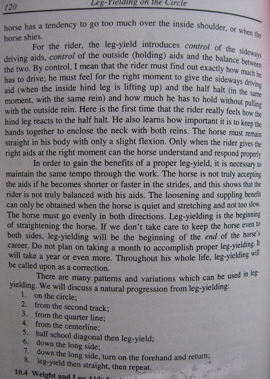 Если возвратиться к обучению всадника/лошади, то я обычно пользуюсь уступкой ограниченно, делая только упражнение по расширению вольта уступкой. Как только всадник его освоил, сразу перехожу к плечам. Но всегда возвращаюсь к этому боковому, если чувствую в этом какую-либо необходимость.